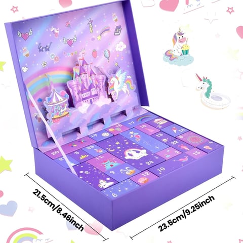 🎅Every Days Surprise - There are different gifts in the beautiful box, so kids can have different surprise at every countdown day. Every gift is packaged in seperate box, and unicorns, bows, flowers, rainbows and clouds are elements that children like.